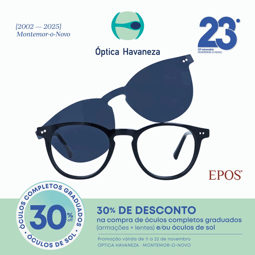 Para celebrar a data, a loja de Montemor-o-Novo lançou uma campanha exclusiva, válida de 11 a 22 de novembro, que oferece um desconto direto de 30% em óculos completos graduados (aros + lentes) e/ou óculos de sol de marcas selecionadas. A iniciativa pretende agradecer a fidelidade dos montemorenses, promovendo ao mesmo tempo o acesso a produtos de qualidade, com o selo de experiência e credibilidade que distingue a Óptica Havaneza há mais de oito décadas.